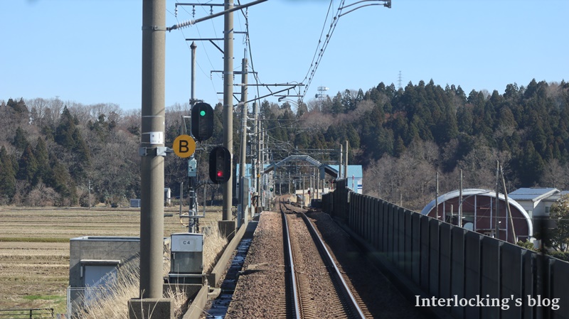 犀潟駅を出発してしばらく高架区間を走行すると、第2閉そくの中継信号機が見えてきます。