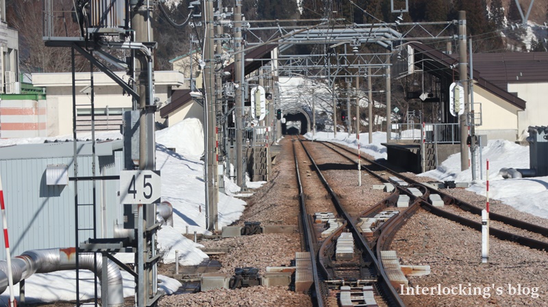 まつだい駅の分岐器です。ノーズ可動の分岐器であり、電気転てつ機が2台設置されています。