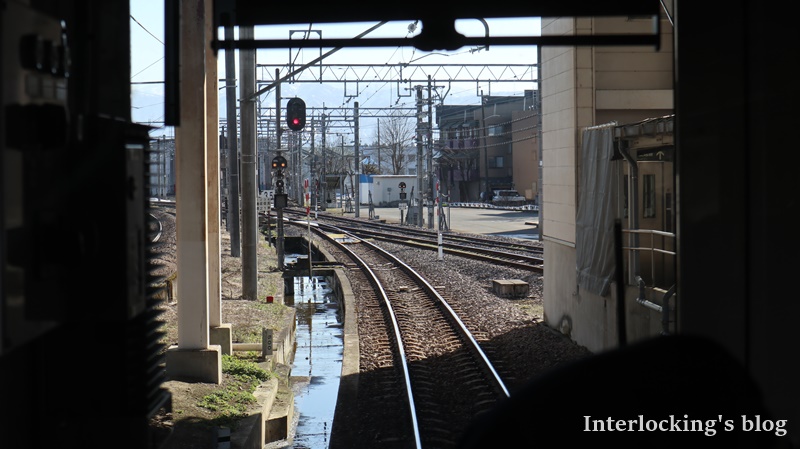 犀潟駅で停車した後、保安装置をATS-Pへ切り換えてほくほく線へ。